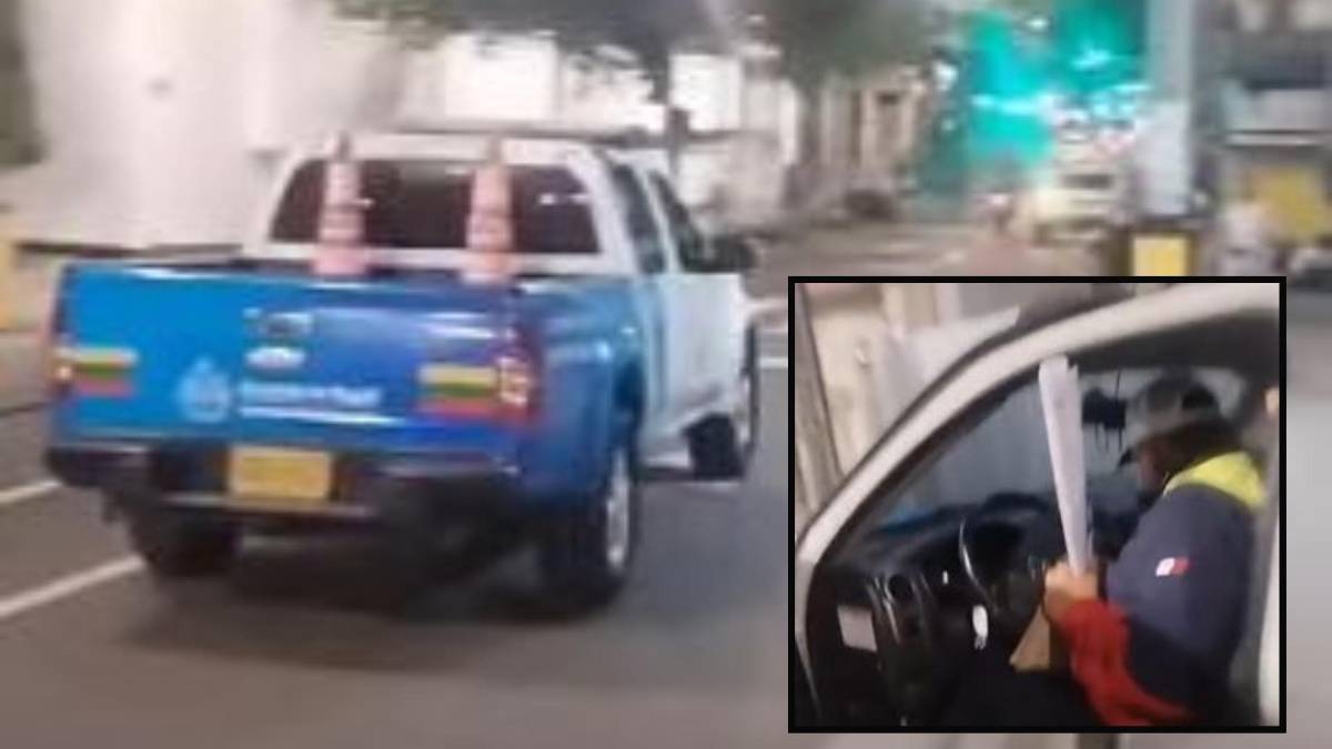 • Adelante, el conductor del vehículo, quien sería un agente de tránsito, llevando lo que según la denuncia sería un pendón de una campaña política. Atrás, el vehículo oficial implicado. FOTO: imagen tomada de redes