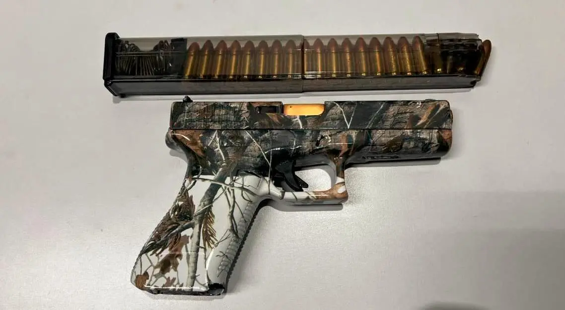 Era una pistola 9 mm personalizada, pintada en blanco con diseño de selva y con proveedores transparentes de doble capacidad, diseñada para prolongar el fuego en enfrentamientos.