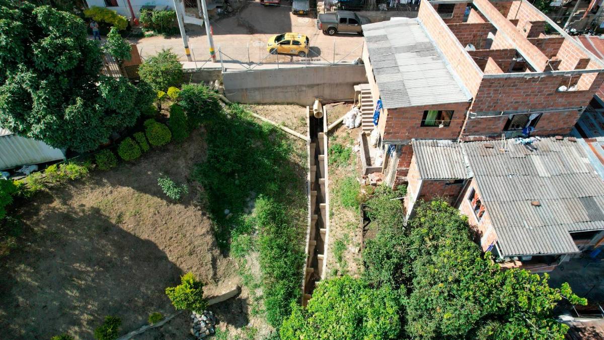 “Aquí diseñamos un canal para colectar unas aguas lluvias que bajan todo el tiempo desde la parte alta del Beneficio, que permeaban el suelo, desestabilizándolo. Desarrollamos un canal con disipadores de energía para reducir la potencia del agua, recogiendo tanto aguas perdidas como las de la vía, con esto garantizamos la estabilidad de las viviendas y protegiendo las vidas”, manifestó Lucas Alberto Espinosa Toro, director administrativo de Gestión del Riesgo, Desastres y Emergencias de Itagüí.