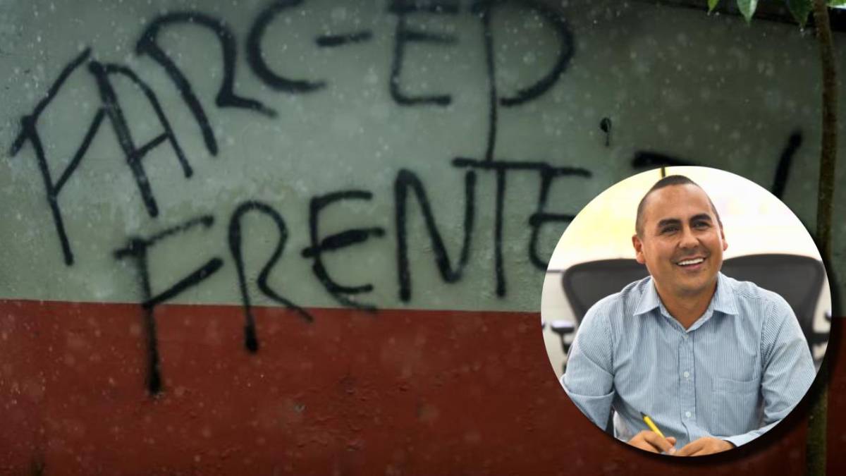 En el fondo, un grafiti alusivo al Frente 36 de las disidencias de las FARC en el municipio de Briceño, Norte de Antioquia. En miniatura en la esquina inferior derecha, el alcalde de esta localidad. Noé Espinosa Vásquez. FOTOS Camilo Suárez y Alcaldía de Briceño.