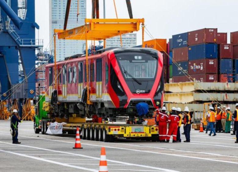 El primer tren de la Línea 1 del Metro de Bogotá durante su llegada desde China a Cartagena. Se prevé que cinco de estos trenes lleguen al país en este 2025. FOTO: ALCALDÍA DE BOGOTÁ