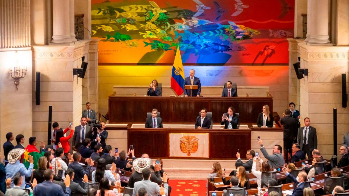 En el Salón Elíptico del Congreso de la República, minutos antes de las palabras del jefe de Estado, se empezó a escuchar una de las arengas que se popularizaron durante las jornadas de protesta del Paro Nacional.