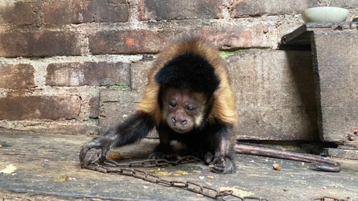 El mono fue encontrado atado a la base de una estructura realizada de forma artesanal por las personas que lo tenían en cautiverio, en el patio al interior de la vivienda con graves signos de desnutrición. El animal, que posteriormente se descubrió que se trataba de un mono maicero hembra (Sapajus apella), fue encontrada con infecciones oculares y con lesiones en su cadera, donde permanecía atada por una cadena.