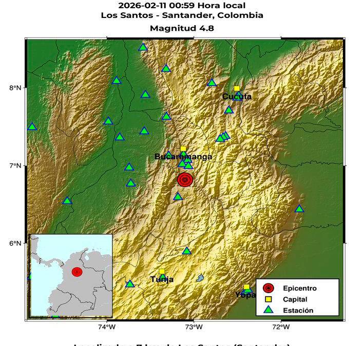 Un sismo de magnitud 4,8, según el Servicio Geológico Colombiano, con epicentro en el departamento de Santander, concretamente en Los Santos, se sintió en Medellín, algunos otros municipios y de Antioquia y buena parte del país este miércoles 11 de febrero a las 12:59 de la madrugada.