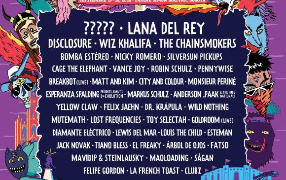 El plato fuerte lo conforman Lana del Rey, Disclosure, Wiz Khalifa y The Chainsmokers. La cuota colombiana la encabezan Bomba Estéreo, Monsieur Periné, Diamante Eléctrico, Doctor Krápula y Esteman.