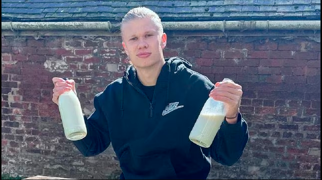 Haaland publicó esta semana unas fotos en las que se le ve posando con unas botellas de algo que parecía ser leche. Sin embargo, el Diario The Sun salió con una exclusiva en donde afirman que el contenido de este envase, además de leche, posee un batido de espinaca y kale que han fortalecido a este potente goleador.