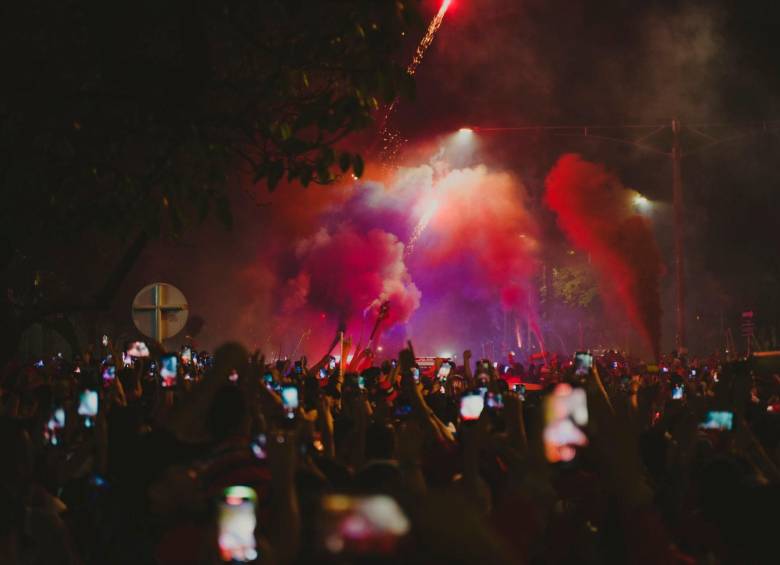 Mientras las voces de los aficionados se escuchaban al unísono y en las tiendas de la primera planta del Obelisco y de la acera de la Unidad Deportiva Atanasio Girardot sonaba la canción Grita el pueblo clamoroso de Alfredo Gutiérrez, algunos hinchas tiraron bengalas azules y rojas para decorar el cielo nocturno con los colores del Poderoso.