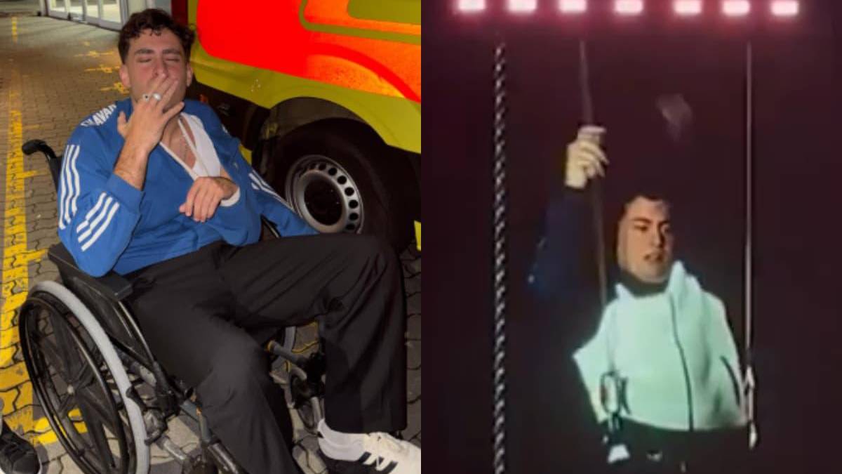 El incidente ocurrió apenas iniciaba el show, cuando el artista malagueño se preparaba para realizar un salto desde una estructura elevada, un efecto pensado para sorprender al público como parte de la puesta en escena de su gira “La Madrugá Tour”. Sin embargo, el sistema de sujeción no respondió como estaba previsto y el cantante se precipitó al vacío ante la mirada de miles de asistentes.