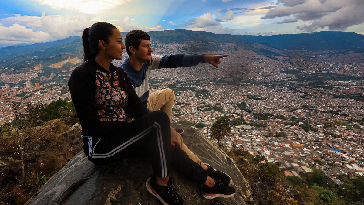 La gente cruza las rejas, se sienta en enormes rocas o en las cornisas naturales. Un grupo tiene parlantes y destapa latas de cerveza. Otro enciende baretos y quedan lelos, con rostros congelados. “Acá es bueno venir, pero con parceros, en combitos. Con la polla sola no, con un parchecito de amigos”, dice Restrepo. Y en la aplicación, ¿ustedes le dicen a la gente cosas de la seguridad y demás? “Sí, les damos un relato de nuestras experiencias, la gente toma la decisión si sube o no. Además, la mayoría de los miradores públicos son seguros. En este, por ejemplo, hay celadores”, dice Vahos. “Yo vendría acá con amigos, pero con la novia no: se ven muchas valijas”, dice Juan Pablo Estrada, el camarógrafo, y alista los equipos para comenzar la entrevista. Entre tanto aparece Fabián.