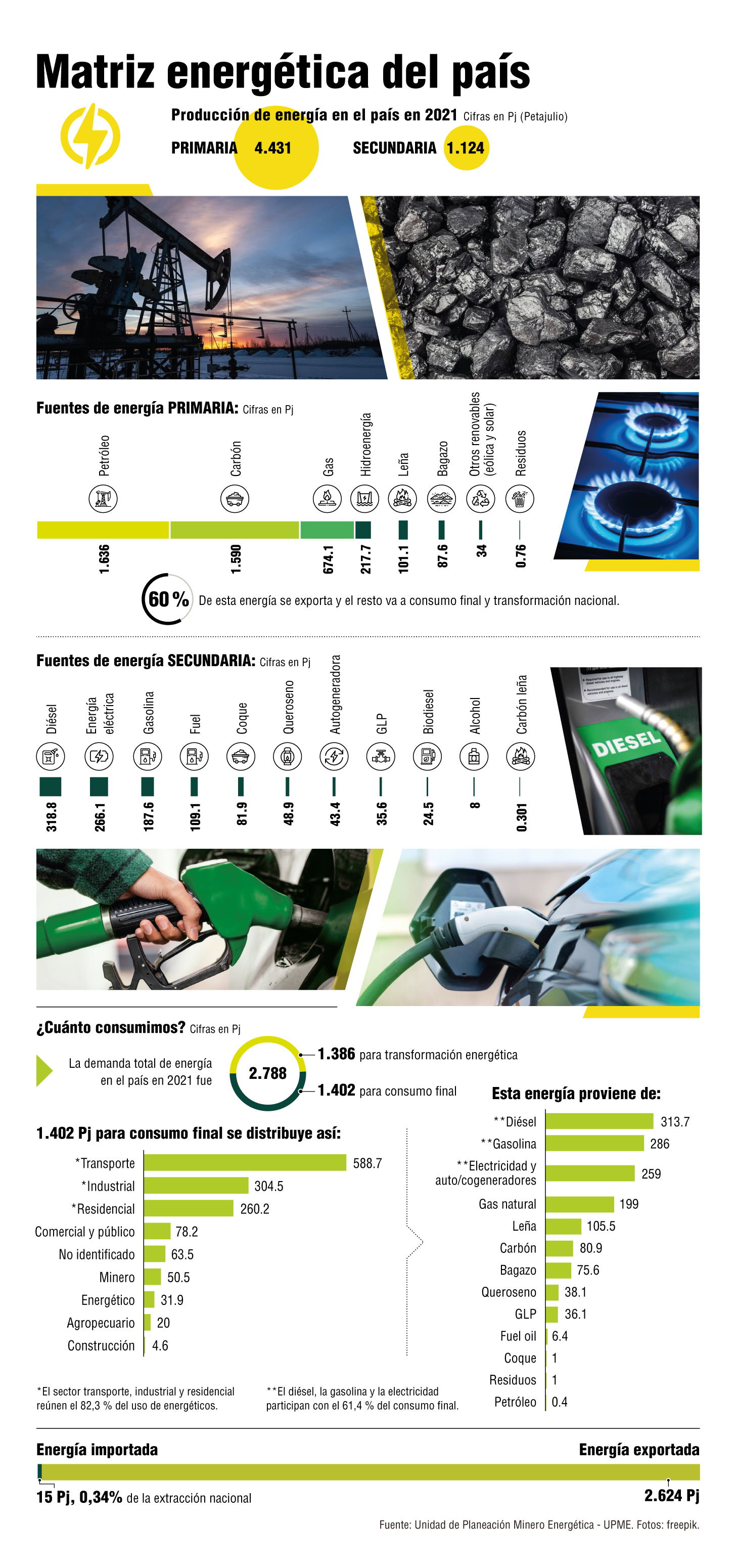 Además, precisa que en el informe presentado por Colombia en 2021 ante la ONU, en su matriz energética de 2018, 59 % de los GEI provenían de Afolu (siglas en inglés de agricultura, ganadería, forestación y otros usos del suelo), mientras que el transporte originaba 12 % de las emisiones, la generación de energía producía 8 % y la industria manufacturera y la construcción el 4 %.