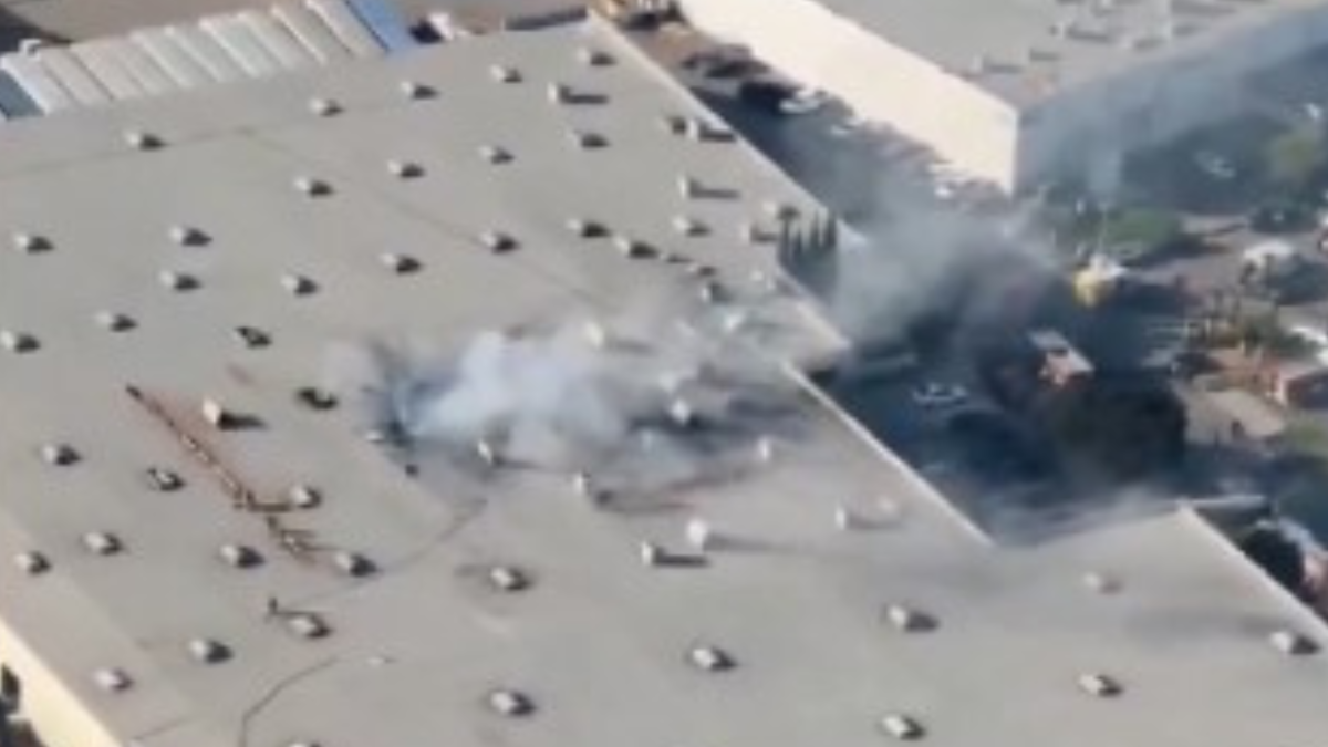 Imágenes captadas por una cámara de seguridad aledaña y divulgadas en redes sociales muestran el momento en que la pequeña aeronave impacta el techo de una estructura comercial próxima a un aeropuerto local levantando una bola de fuego y una columna de humo negro.