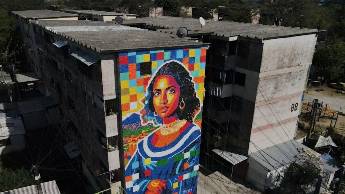 La obra muestra a una mujer de rasgos latinos con pelo negro, un vestido colorido, pendientes, un collar y una mirada penetrante, en una figura ligeramente de perfil. “He querido representar a una Gioconda latinoamericana”, dice a la AFP el artista de la obra, el venezolano Óscar Olivares, quien a sus 29 años ya ha hecho murales en Venezuela, México, Arabia Saudí e Italia.