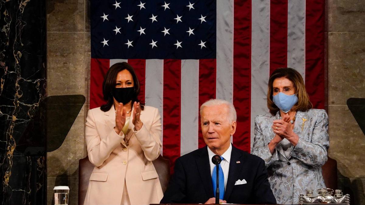 Con dos mujeres guardando su espalda, Joe Biden hizo un corte adelantado a sus primeros 100 días de gobierno. Ante un Congreso que no controla del todo y en el que tiene en parálisis varias de sus propuestas más importantes, el presidente de Estados Unidos celebró en la noche del 28 de abril el reinicio del tiempo que prometió como candidato.