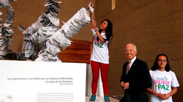 Allí, en este sitio de memoria para las víctimas, Biden dejó un mensaje que fue muy bien recibido por todos aquellos que han padecido las confrontaciones en el país: “Como dijo el poeta holandés: “un sufrimiento muy largo nos da un corazón de piedra. La única cura es La Paz y la reconciliación” - Colombia debe terminar este trabajo - los niños nos mostrarán el camino- Joe Biden. Vice Presidente. USA”, reza la tarjeta que luego fue puesta en un espacio denominado Árbol de la Vida, Generación Paz.