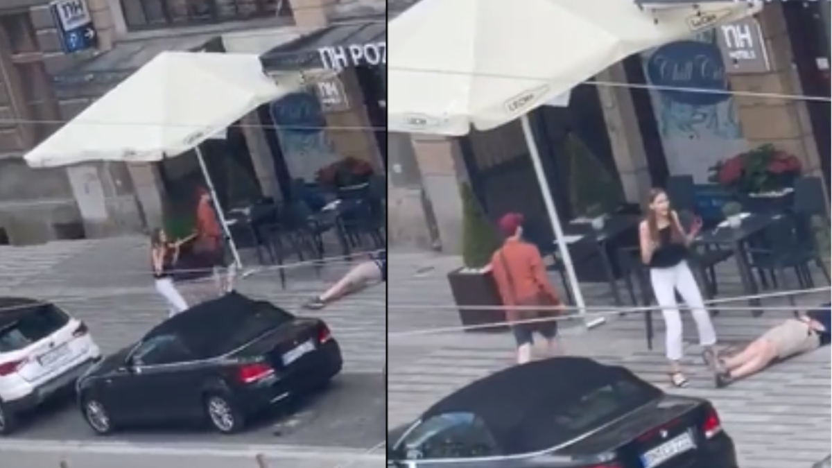 Las imágenes perturbadoras tomadas fuera de un hotel en el centro de la ciudad, en el pintoresco distrito turístico de Poznan, Polonia, muestran a Domagała tirado en el suelo mientras su angustiada prometida de 20 años se agacha sobre él.