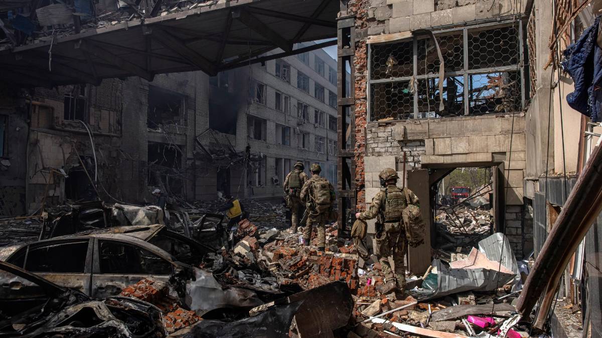 Soldados ucranianos caminan al lado de una estructura dañada por un bombardeo ruso en Kharkiv. FOTO: EFE.