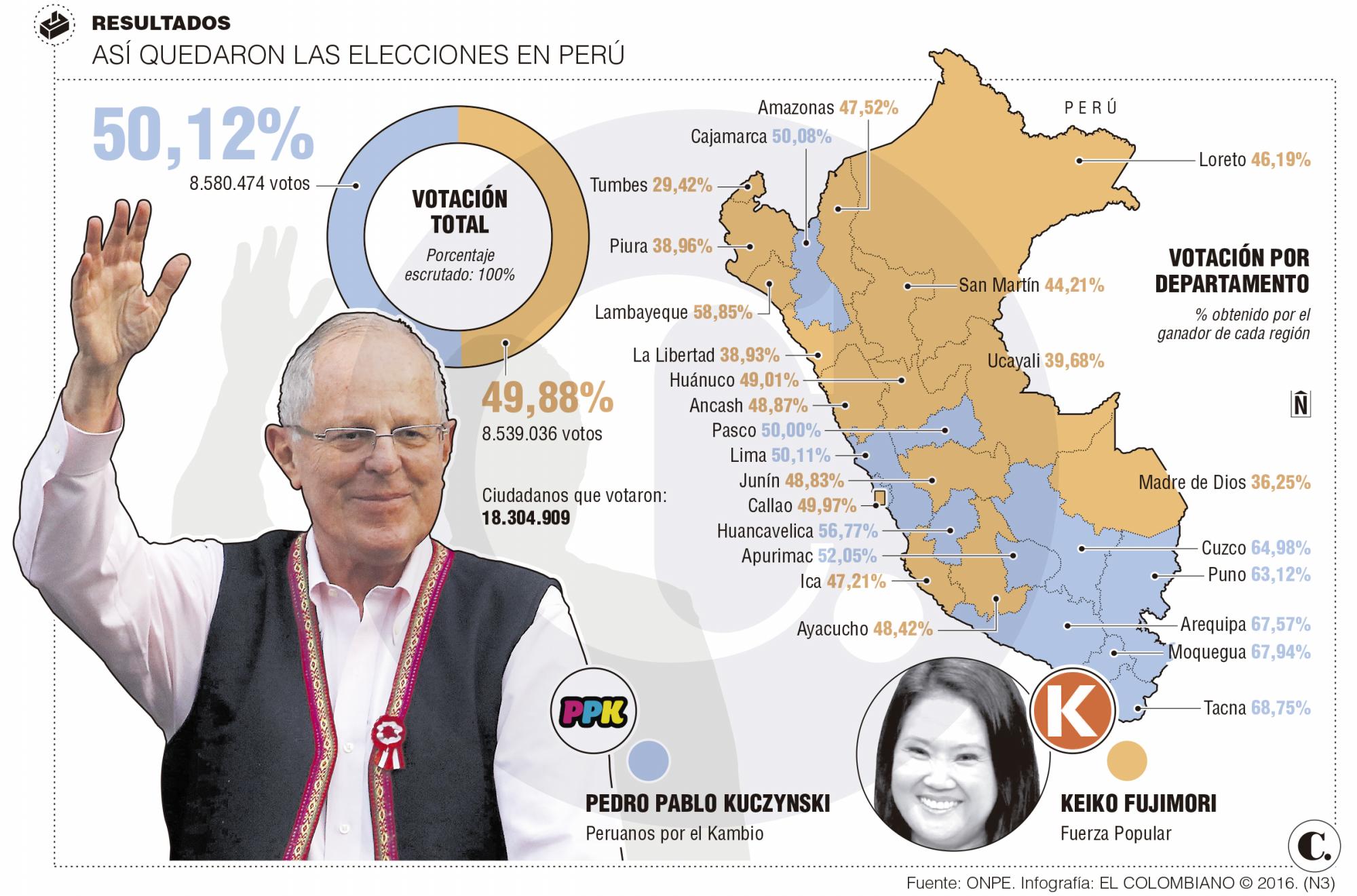 Pedro Pablo Kuczynski (PPK), un candidato tímido en las tribunas, punteaba los conteos desde el domingo con porcentajes que parecían insignificantes: primero, 1,05 %; luego, 0,56 %, y en la tarde de ayer, un minúsculo pero contundente 0,24 %, que le dio 41.438 votos a favor y la victoria en la economía más prometedora de la región.