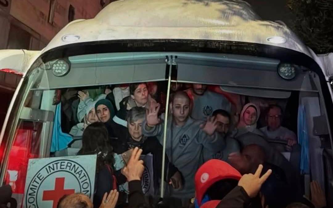 En una rotonda de la ciudad, cerca de la carretera que lleva a la prisión, también se habían reunido cientos de personas que corearon, cantaron e hicieron sonar las bocinas de sus autos al paso de los autobuses. Algunas llevaban banderas palestinas y de Hamás.