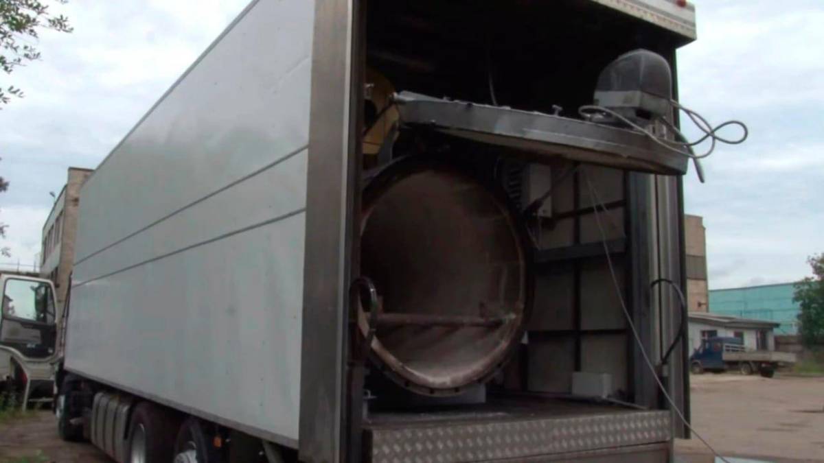 • Así se ve uno de los supuestos 13 crematorios móviles que estarían en Mariúpol. FOTO CORTESÍA