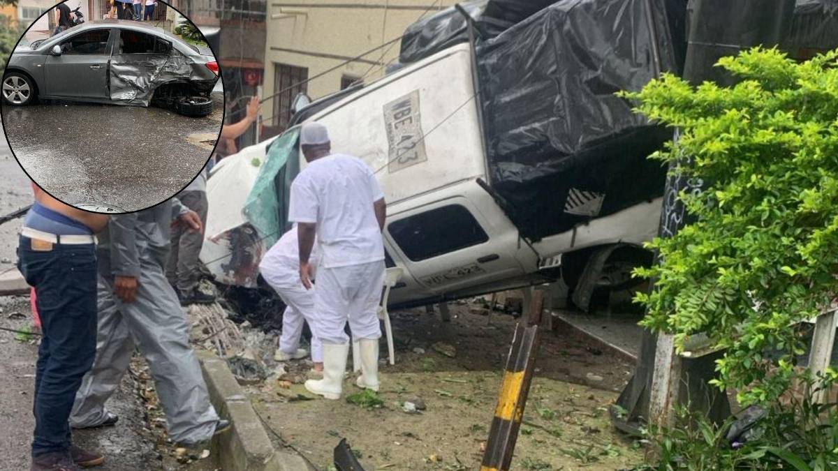 Un carro de carga perdió los frenos en la loma de Robledo y chocó contra un vehículo gris y una motocicleta. Cuatro personas resultaron heridas, dos con lesiones graves.