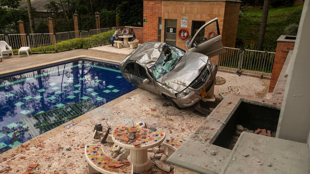 Un fuerte estruendo sobresaltó a los vecinos del barrio San Lucas, en El Poblado, hacia las 7:00 de la noche del pasado lunes, luego de que un carro rompiera un muro de ladrillo de un parqueadero y cayera de una altura de tres pisos, quedara con su parabrisas destruido y diera varias vueltas hasta quedar a escasos metros de la piscina.