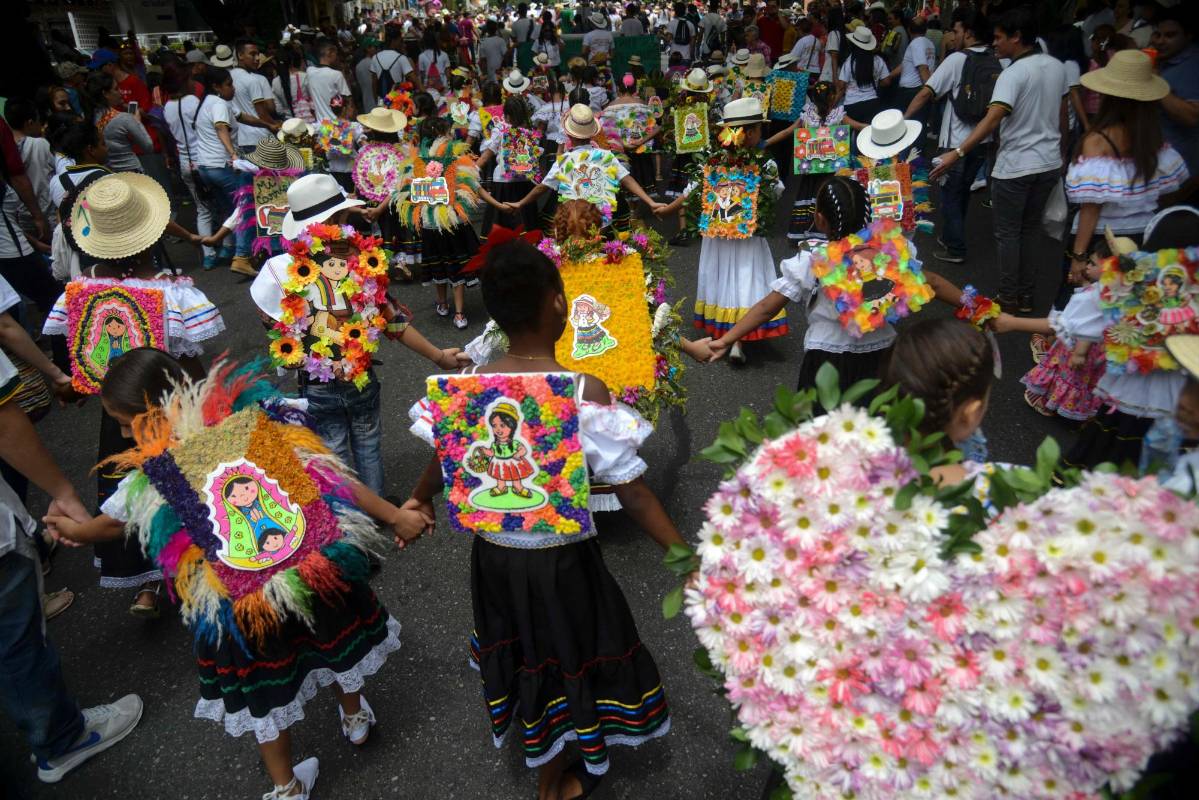 Más de 2.000 niños silleteros desfilaron este sábado por las calles de Medellín con sus adornos florales para mantener una conexión con sus tradiciones, en el marco de la edición 59 de la Feria de las Flores. FOTO AFP -