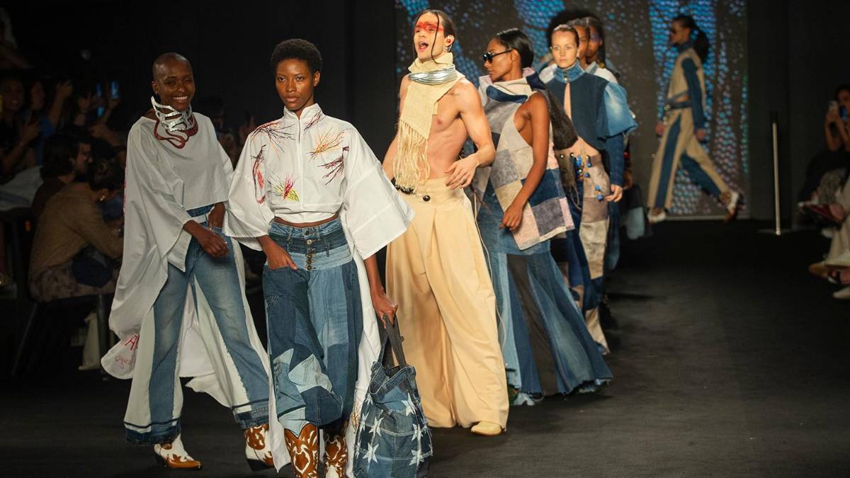 El desfile mostró prendas de denim reciclado, bordados detallados y volúmenes audaces, reflejando la herencia cultural latinoamericana y el compromiso con la moda sostenible. Foto: Camilo Suárez -