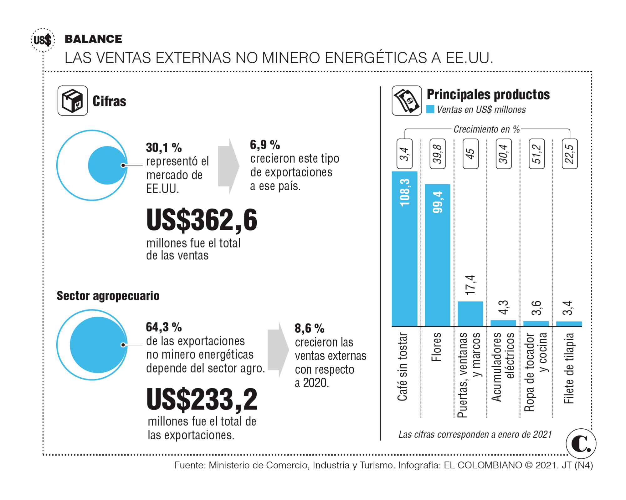 Según el balance entregado por el Ministerio de Comercio, Industria y Turismo, en enero de 2021 las exportaciones de bienes no minero energéticos a Estados Unidos aumentaron 6,9 %, al pasar de 339,2 millones de dólares en enero de 2020 a 362,6 millones de dólares en el mismo mes de este año.