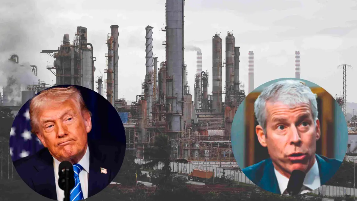 • El Centro de Refinación Paraguaná, el complejo refinador más grande de Venezuela, es una pieza clave en la cadena petrolera que Estados Unidos busca supervisar y reorganizar. De izquierda a derecha: Donald Trump, presidente de Estados Unidos y Chris Wright, secretario de Energía de EE. UU. FOTO Getty