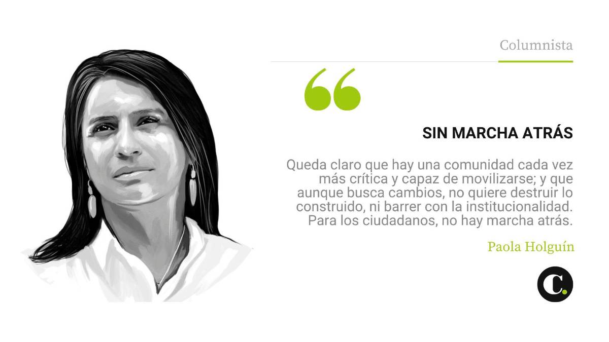 Hoy nos queda claro que los colombianos en las calles se están uniendo en torno a una agenda de país, que todos los sectores deberíamos escuchar; queda claro también que hay una comunidad cada vez más crítica y capaz de movilizarse; y que aunque busca cambios, no quiere destruir lo construido, ni barrer con la institucionalidad. Para los ciudadanos, no hay marcha atrás.